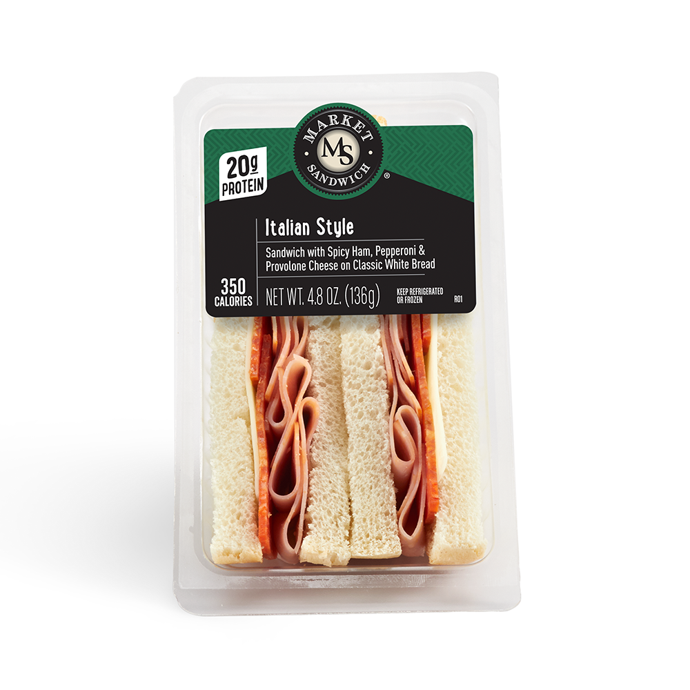 Market Sandwich Italian Style Wedge is made with spicy ham, pepperoni, and provolone cheese on sliced bread; ready to enjoy!